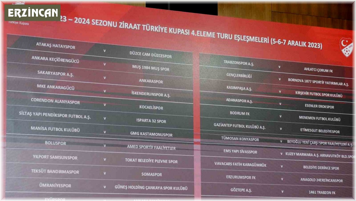 Erzincan - Ziraat Türkiye Kupası 4. Eleme Turu kura çekimi, TFF Riva Hasan Doğan Milli Takımlar Kamp ve Eğitim Tesisleri Orhan Saka Konferans Salonu'nda gerçekleşti. Kura çekimine, Türkiye Futbol Federasyonu Başkanı Mehmet Büyükekşi, federasyon yetkilileri ve kulüp temsilcileri katıldı. Bu turda 27 takım seri başı sistemine göre eşleşti. Müsabakalar tek maç eleme usulüne göre 5-6-7 Aralık tarihlerinde oynanacak.