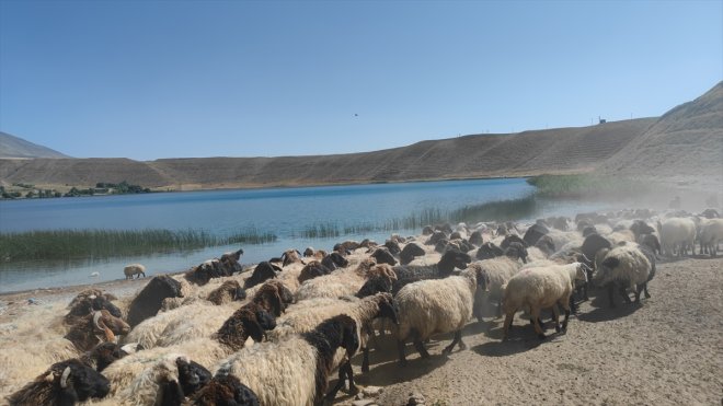 BİTLİS - Bitlis'in Adilcevaz ilçesindeki çobanlar, sıcaktan etkilenen küçükbaş hayvanların su ihtiyacını Aygır Gölü'nden karşılıyor.