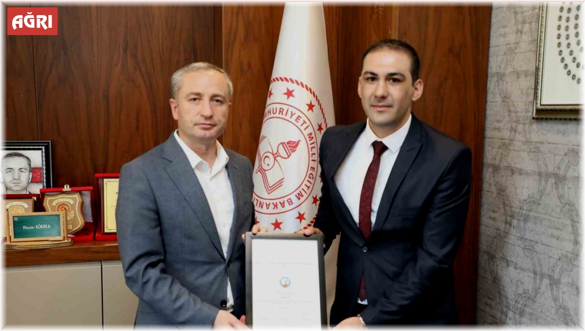 Ağrı İl Milli Eğitim Müdürü Hasan Kökrek, STEM faaliyetlerine katkı sunmak için kurs ve eğitimler sonucu Scientix elçisi unvanını alan Ar-Ge biriminde proje koordinatörü olarak görev yapan Nesim Zariç'e 'Avrupa Okul Akademisi Kurs Tamamlama Sertifikası'nı takdim etti.