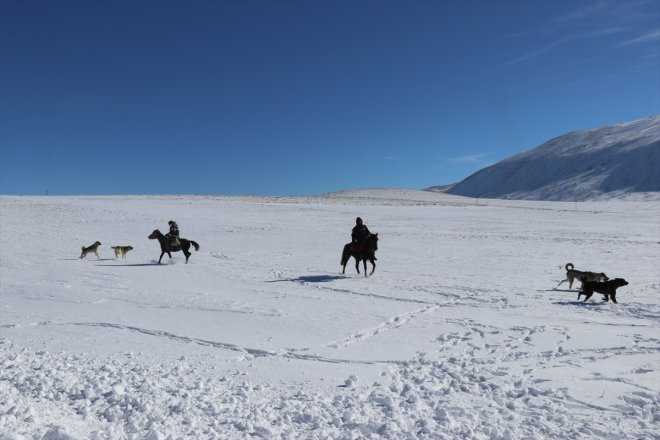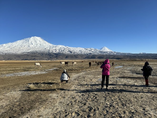 Ardından 5137 metrelik rakımıyla yurdun en yüksek noktası olan Ağrı Dağı'nın yakınlarına giden fotoğrafçılar, arazide otlayan atlar ile dağın fotoğraflarını çekerek vakit geçiriyor.