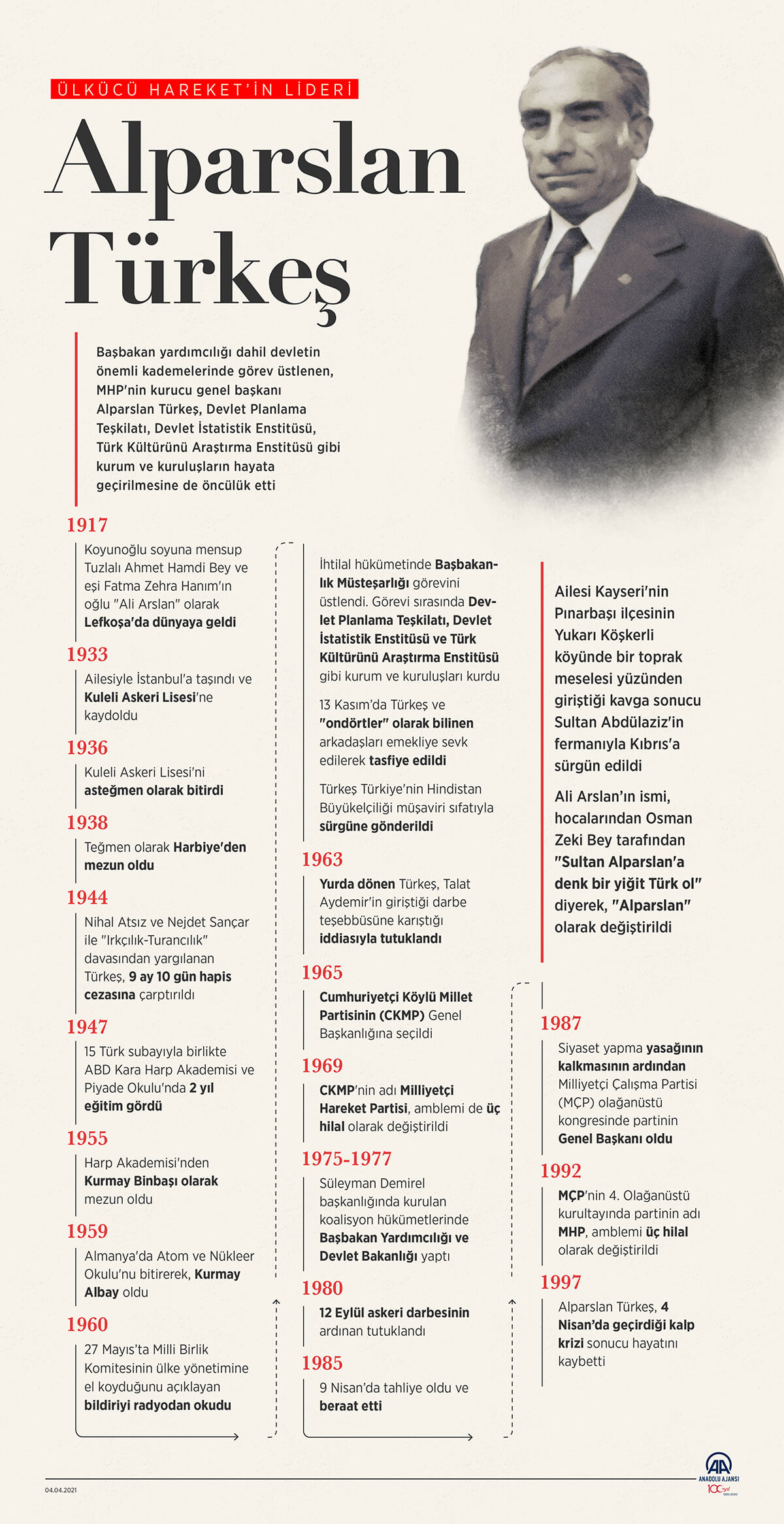 Türk siyasi tarihinin önemli isimlerinden Alparslan Türkeş kimdir? doğum adı (Ali Arslan). Kayseri'nin Pınarbaşı ilçesinin Yukarı Köşkerli köyünde yaşayan Koyunoğlu ailesinin bir toprak meselesi yüzünden giriştiği kavga sonucu; Sultan Abdülaziz'in fermanıyla Kıbrıs'a sürgün edilmesi nedeniyle; 25 Kasım 1917'de, Koyunoğlu soyuna mensup Tuzlalı Ahmet Hamdi Bey ve eşi Fatma Zehra Hanımın oğulları "Ali Arslan" olarak Lefkoşa'da doğdu. Alparslan Türkeş, 4 Nisan 1997'de geçirdiği kalp krizi sonucu hayatını yitirdi. Alparslan Türkeş haberleri ve son dakika gelişmelerine ait tüm haberleri listeleyin.