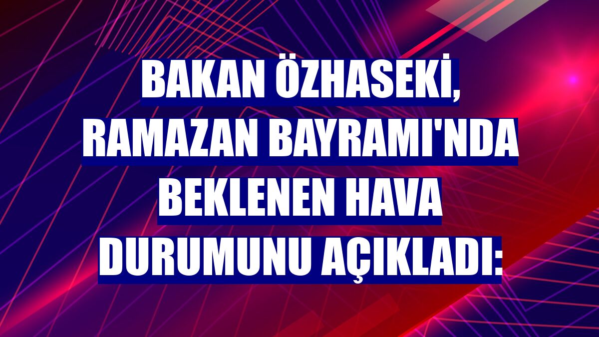 Bakan Özhaseki, "Ülkemizde hava sıcaklıklarının, hafta boyunca mevsim normalleri civarında ve yer yer altında seyredeceği, 9 günlük tatil boyunca ülkemiz genelinde yer yer sağanak ve gök gürültülü sağanak yağış olacağı tahmin edilmektedir. Tüm milletimizin Ramazan Bayramı'nı şimdiden kutluyor, sevdiklerimizle bir ve beraberce geçireceğimiz bir bayram olmasını temenni ediyorum." ifadesini kullandı.