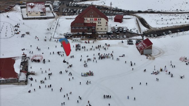 Fotoğrafçılar, Gençlik ve Spor İl Müdürlüğü tarafından Hesarek Kayak Merkezi'nde düzenlenen programda, paraşüt ve Türk bayraklarıyla yapılan kayak gösterisini görüntüledi.