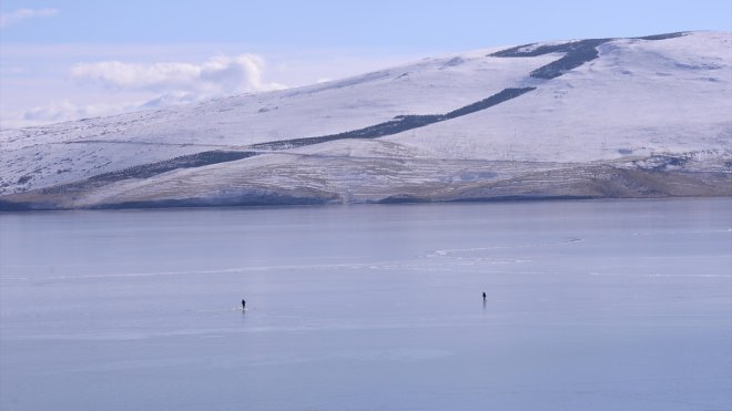Ardahan ile Kars arasındaki Çıldır Gölü'nün yüzeyi, son günlerde etkili olan dondurucu soğukların etkisiyle büyük oranda dondu.