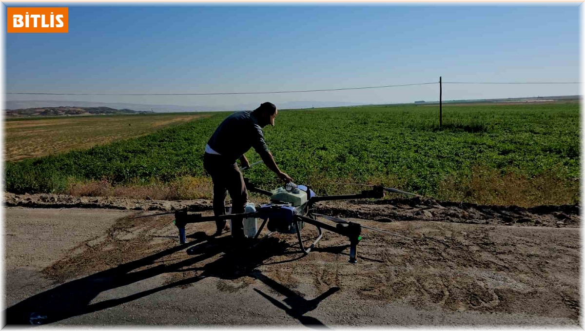 Bitlis: Tarımsal açıdan önemli bir konuma sahip olan Adilcevaz ilçesi, tarım yapan çiftçiler traktörle yapılan ilaçlama yöntemine alternatif olarak dronla ilaçlamaya başladı. Bu yeni yöntem, tarımsal üretimde tasarruf sağlayarak ürünlerin zarar görmesini önlemeye yardımcı oluyor. Geçen yıl olduğu gibi bu yılda kurt istilasına uğrayan fasulyeler çiftçileri tedirgin ediyor. Hummalı bir çalışma başlatan çiftçiler, tarım arazilerinin zarar görmemesi için dronla ilaçlamaya başladı.