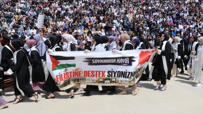 Erzincan - Erzincan Binali Yıldırım Üniversitesinde (EBYÜ) mezuniyet töreninde öğrenciler, İsrail'in Filistin'e saldırılarını protesto edip Gazze halkına destek verdi.