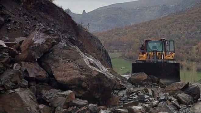 Hakkâri - Hakkari'nin Şemdinli ilçesinde yola düşen kaya parçaları ekiplerin çalışmasıyla kaldırıldı.