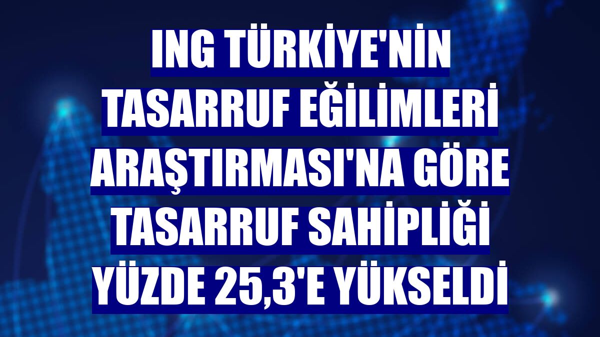 İSTANBUL - ING Türkiye'nin, kentsel yerleşim bölgelerinde yaşayan yetişkin bireylerin tasarruf eğilimlerini izlemek amacıyla 2011 yılından bu yana IPSOS iş birliğiyle gerçekleştirdiği Türkiye'nin Tasarruf Eğilimleri Araştırması'nın (TTEA) 2023 yılı ikinci çeyrek sonuçlarına göre, tasarruf sahipliği 2023'ün ikinci çeyreğinde 6 puanın üzerinde artışla yüzde 25,3'e yükseldi.
