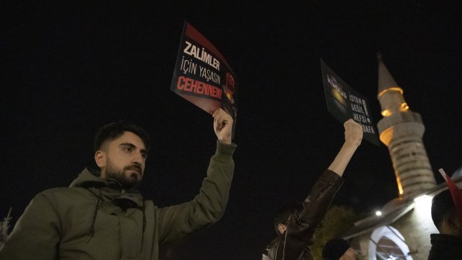 Katılımcılar, Türk ve Filistin bayrakları sallayıp tekbirler getirerek, "Kahrolsun İsrail", "Filistin'e selam", "Katil İsrail" sloganları attı.