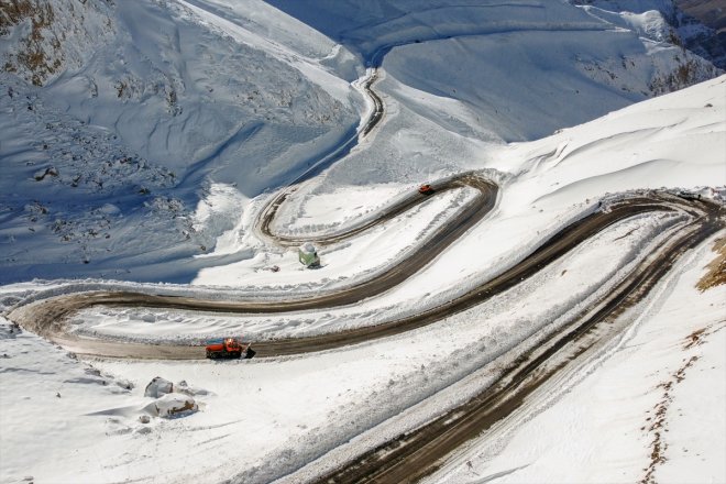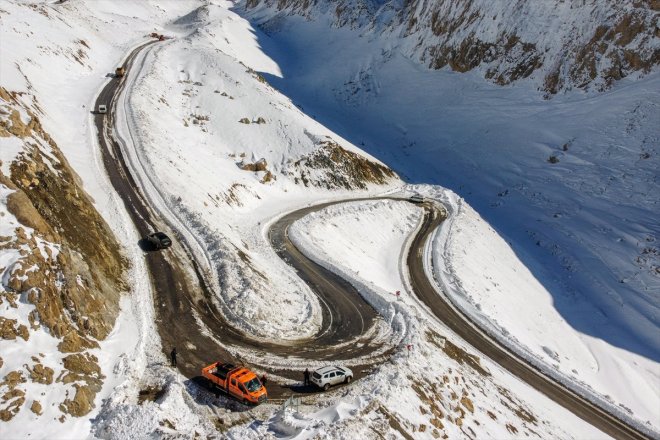 Zaman zaman tipinin etkili olduğu kara yolunda ulaşımın aksamaması için ekipler çalışmalarını sürdürüyor.
