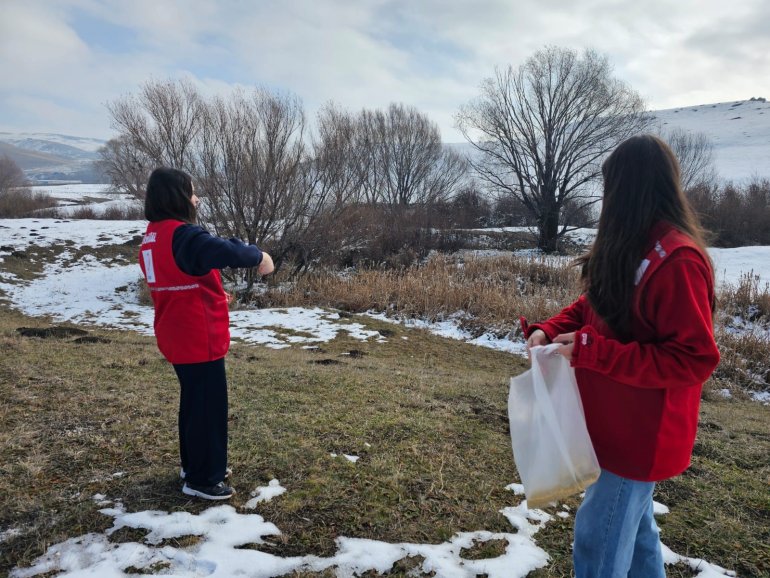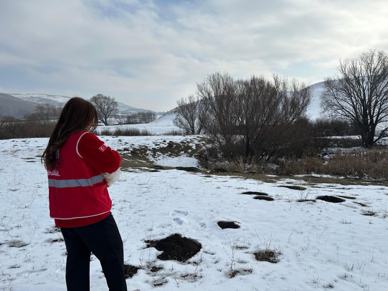 Kızılay Ağrı Şubesi gönüllüleri, artan soğuk hava şartları ve yağan kar nedeniyle yem bulmakta zorlanan kuşlar için harekete geçti. Şube Başkanı Orhan Tatlı'nın da katıldığı çalışmada, kuşların doğal yaşam alanlarına yem bırakıldı.