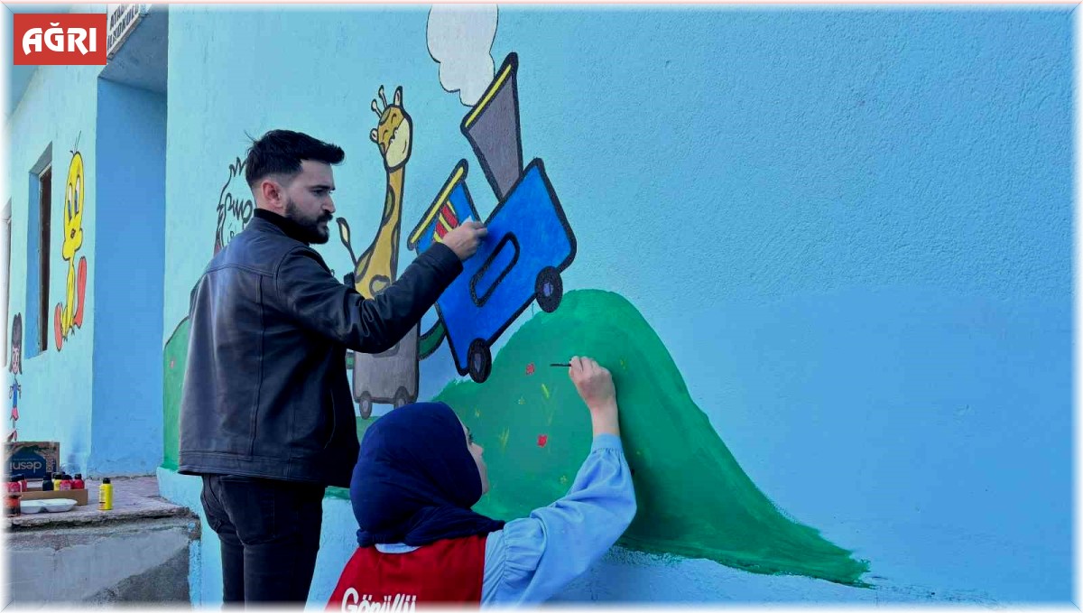 Kızılay Ağrı Şube Başkanlığı gönüllüleri, Tutak ilçesine bağlı Atabindi köyündeki ilkokulda öğrenciler için duvarları rengarenk boyadı.