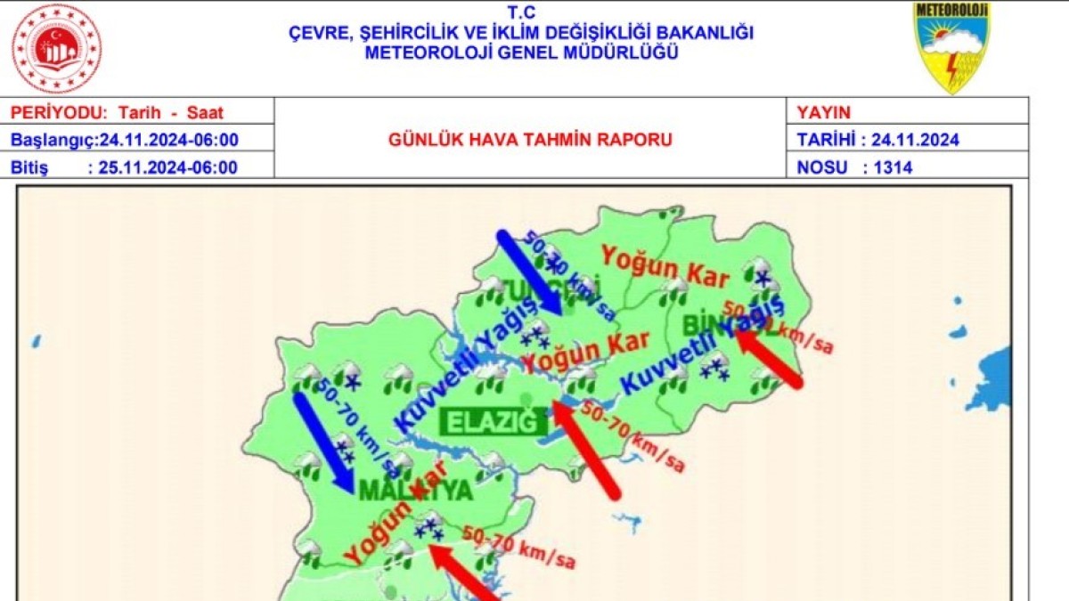 Elazığ - Meteoroloji 13. Bölge Müdürlüğü'nden yapılan açıklamada, "Yapılan son değerlendirmelere göre; sabah saatlerinden itibaren bölge genelinde kuvvetli yağış bekleniyor. Yağışların sabah saatlerinde yüksek kesimlerde ve akşam saatlerinden sonra havanın soğumasıyla birlikte Elazığ, Malatya, Bingöl ve Tunceli çevreleri ile Adıyaman'ın kuzey kesimlerinde karla karışık yağmur ve kar yağışı şeklinde olacağı(yer yer yoğun kar ) olacağı tahmin ediliyor. Kuvvetli yağışlarla birlikte sel ve su baskını, ulaşımda aksamalar, buzlanma, don ve tipi gibi olumsuzluklara karşı dikkatli ve tedbirli olunmalıdır. Yapılan son değerlendirmelere göre; bölge genelinde rüzgarın Malatya ve Tunceli çevrelerinde kuzeyli; Elazığ, Bingöl ve Adıyaman çevrelerinde ise güney ve güney doğulu yönlerden orta ve kuvvetli, yağış anında fırtınamsı rüzgar(50-70 km/sa) şeklinde esmesi beklendiğinden yaşanabilecek olumsuzluklara karşı dikkatli ve tedbirli olunması gerekmektedir" denildi.