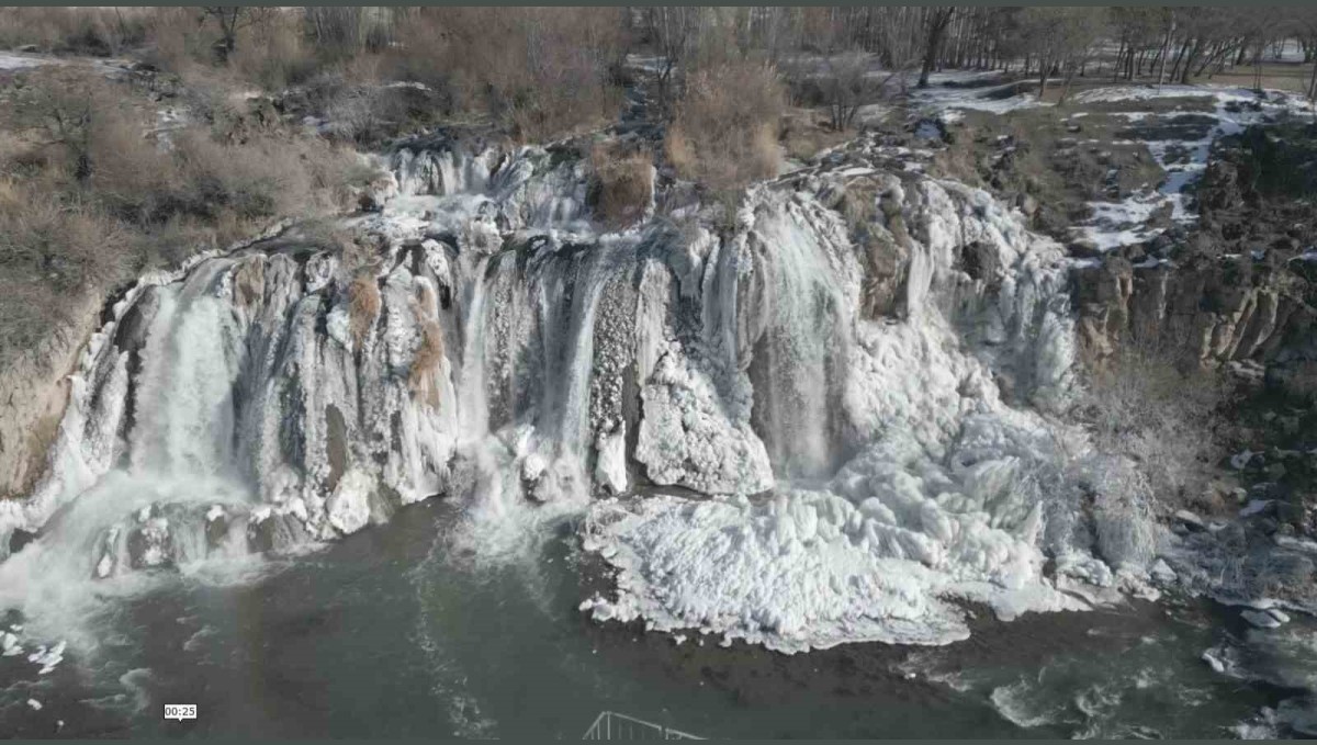 Van'ın Muradiye ilçesinde bulunan ve her mevsim güzelliğiyle ziyaretçilerini hayran bırakan Muradiye Şelalesi, soğuk havalardan dolayı kısmen buz tuttu.