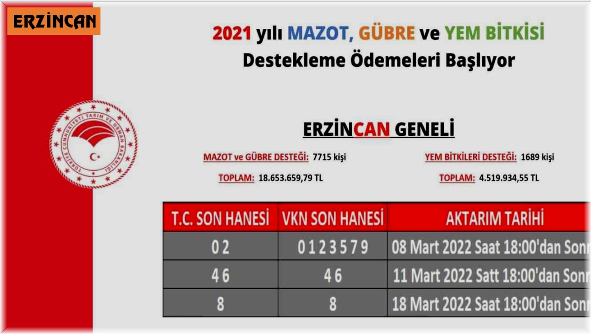 2021 yılı mazot, gübre ve yem bitkisi destekleme ödemeleri 8 Mart itibariyle başlıyor. Erzincan genelinde mazot ve gübre desteği kapsamında 7 bin 715 çiftçiye 18 milyon 653 bin lira destek ödemesi yapılacak.