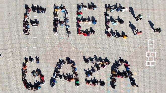 Bu kapsamda okul bahçesinde bir araya gelen 65 öğrenci, Gazze'de yaşanan katliamlara da dikkati çekmek amacıyla öğretmenleri eşliğinde "Free Gaza" koreografisi oluşturdu.