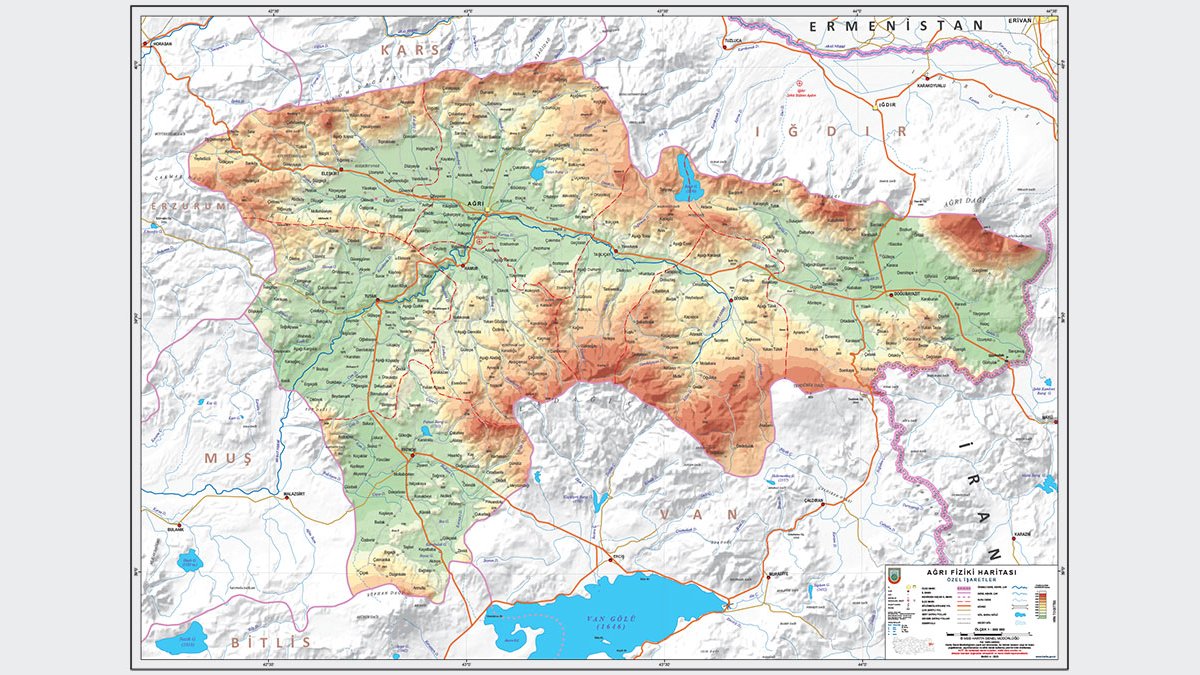 2023 baskılı Ağrı Fiziki İl Haritası, ilin doğal yapısını ve arazi formlarını ayrıntılı biçimde ortaya koyuyor. Fiziki haritada; dağ, ova, dere, çay, nehir, baraj gölü gibi birçok coğrafi unsur yer alıyor.
