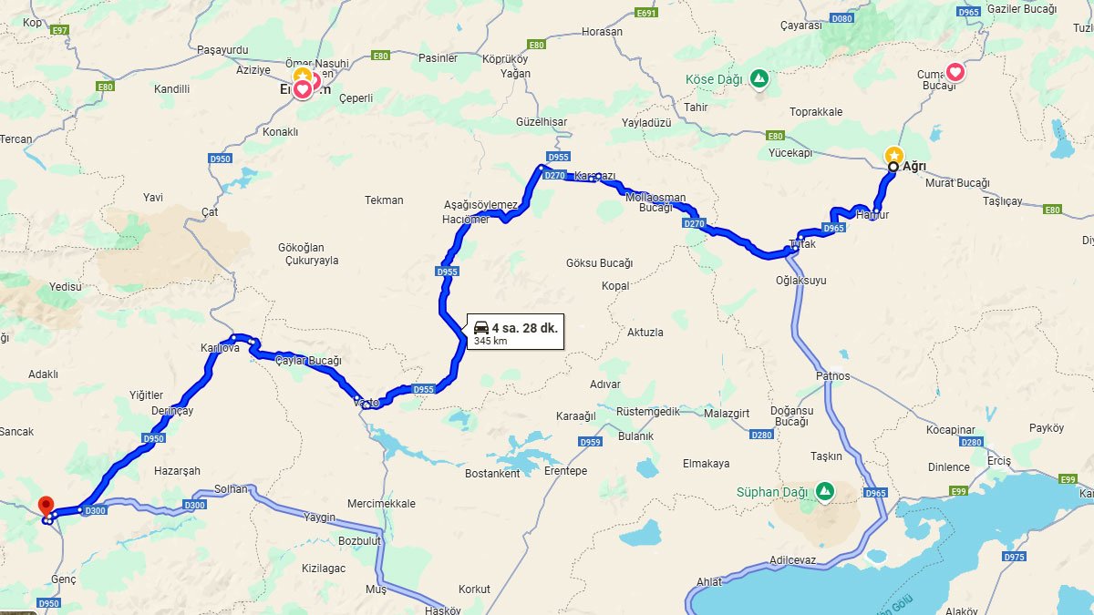 Seyahat, Ağrı Merkez'den Yeni Van Caddesi (D965) üzerinden başlamakta, ardından Hamur, Tutak, ve Karayazı ilçeleri üzerinden geçilerek D270 ve D955 rotaları takip edilmektedir. Bu güzergâh üzerinde yaklaşık 225 kilometre yol kat edilmektedir.