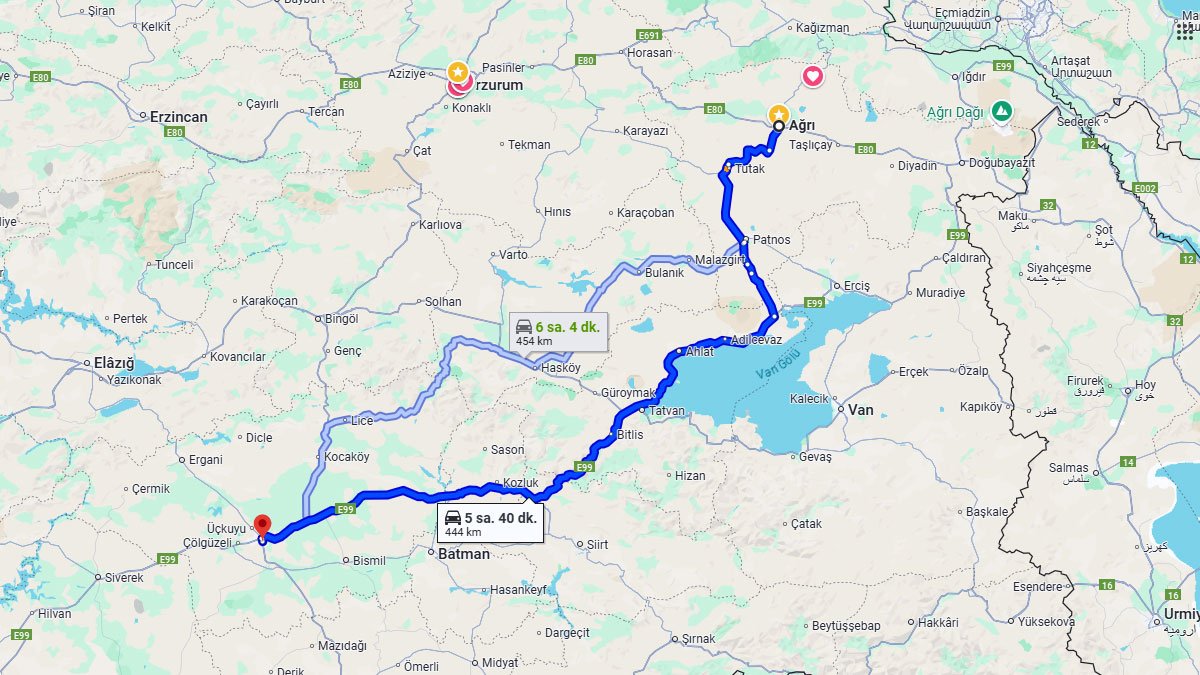 Yolculuk, Ağrı Merkez'den başlayarak Ağrı-Hamur-Tutak-Patnos Yolu üzerinden D965 (E99) rotasına bağlanarak Kömürlü mevkiine kadar yaklaşık 124 kilometrelik bir sürüş ile devam etmektedir.