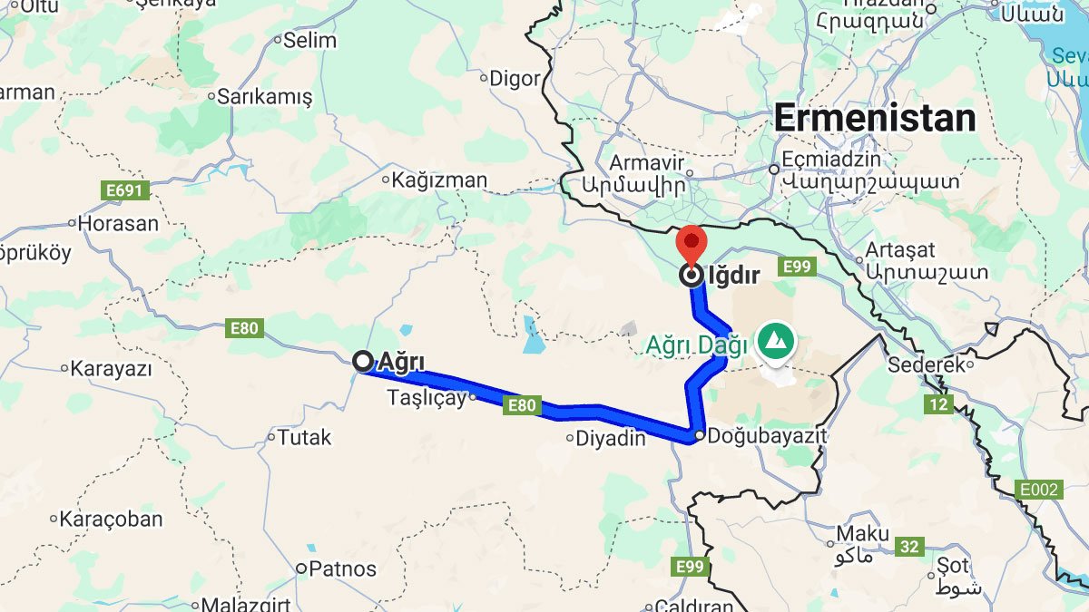 Devamında, D975/E99 üzerinden 48,4 kilometre yol alınarak Iğdır şehir merkezine yaklaşılmaktadır. Şehir merkezine giriş için Kazım Karabekir Caddesi (D080) ve ardından Av. İbrahim Bozyel Caddesi takip edilmektedir. Bu son etap yaklaşık 2,4 kilometrelik bir mesafeyi kapsamaktadır.