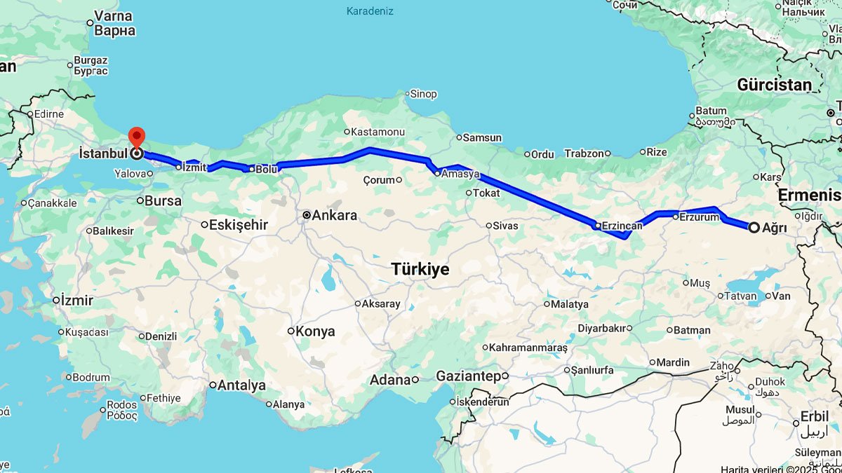 Yolculuk, Ağrı Merkez'den Transit Caddesi üzerinden başlanarak, Erzurum Ağrı Yolu ve Gerede - Gürbulak Otoyolu (D100/E80) hattı üzerinden devam etmektedir. Sürücüler, bu güzergâh boyunca E80, Anadolu Otoyolu (O-4) ve Kuzey Marmara Otoyolu (O-7) gibi otoyolları kullanarak İstanbul'a ulaşmaktadır.