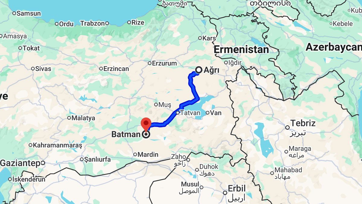 Yolculuk, Ağrı Merkez'den başlayarak Ağrı-Hamur-Tutak-Patnos Yolu üzerinden Kömürlü mevkiine kadar ilerlemektedir. Buradan itibaren Ağrı-Bitlis Yolu (D965/E99) takip edilerek Üçyol kavşağına ulaşılmaktadır. E99 kara yolu güzergâhı boyunca Sason yönündeki çıkış tercih edilmekte ve devamında D955 yolu ile Batman şehir merkezine varılmaktadır.