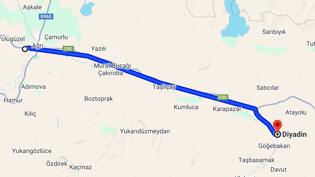 Ağrı şehir merkezinden Diyadin ilçesine ulaşım için en hızlı güzergâh Gerede - Gürbulak Otoyolu (D100/E80) üzerinden sağlanmaktadır. İlk olarak Yeni Van Caddesi (D965) yönünden ilerlenerek yaklaşık 1,2 kilometrelik bir mesafe kat edilir. Ardından döner kavşaktan D100/E80 yönündeki 3. çıkışa girilir ve otoyol boyunca 52 kilometre ilerlenir.