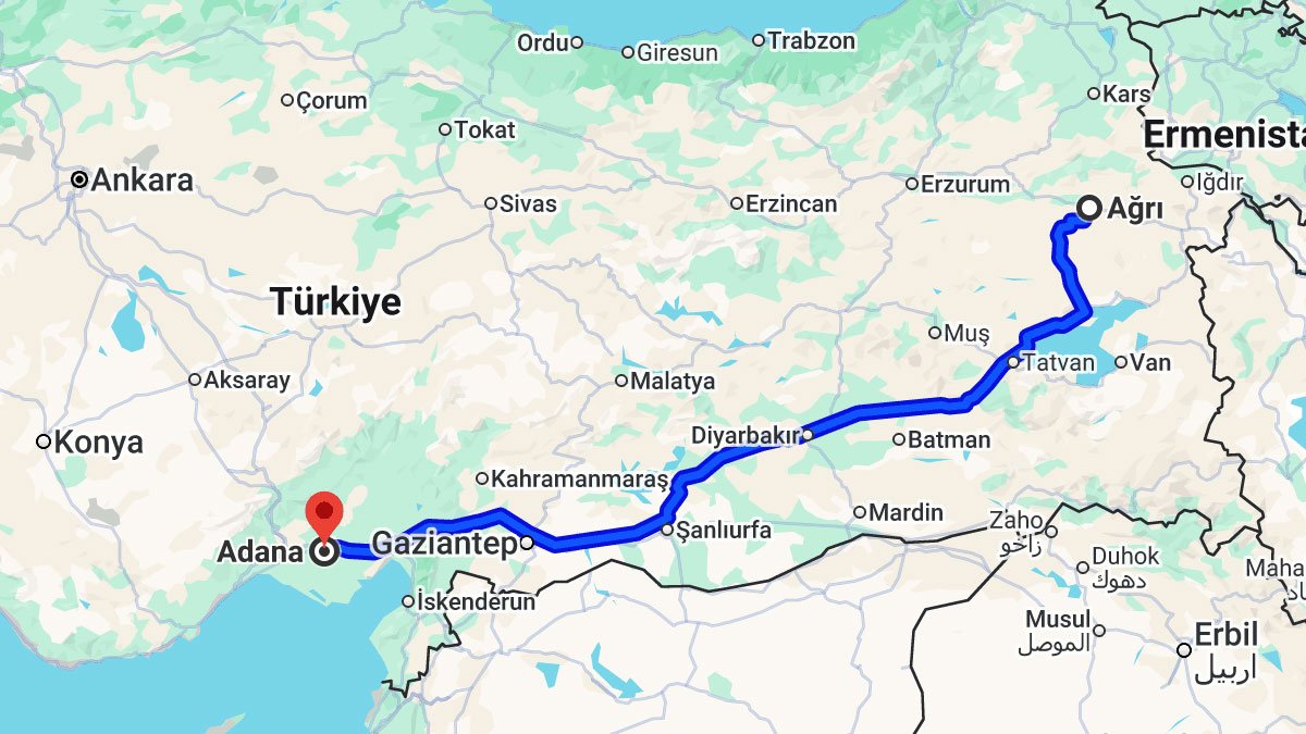 Ağrı ile Adana arasındaki mesafe karayoluyla 965 kilometredir. Ağrı - Adana arası araba yolculuğu ortalama 11 saat 44 dakika sürmektedir.