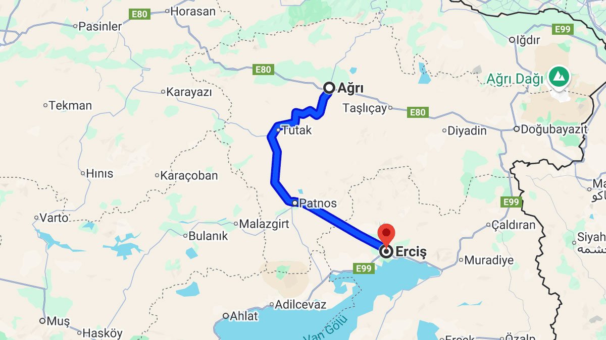 Ağrı ile Erçiş arasındaki yol tarifini öğrenin:
