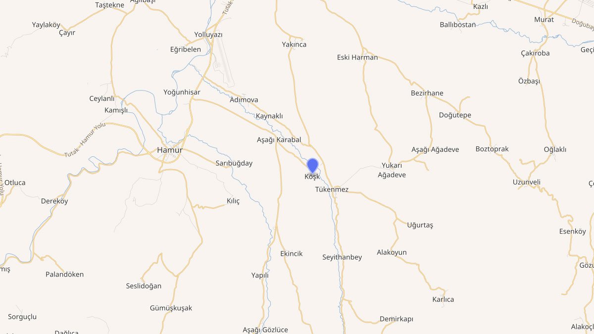 Köşk, Ağrı il merkezine 21 km, Hamur ilçe merkezine 9 km uzaklıktadır. Köyün yönetimi, muhtar ve ihtiyar heyeti tarafından yürütülmektedir. Köyün posta kodu 04852, telefon alan kodu ise 0472'dir. Köy, 1912 yılından bu yana aynı ismi taşımaktadır.
