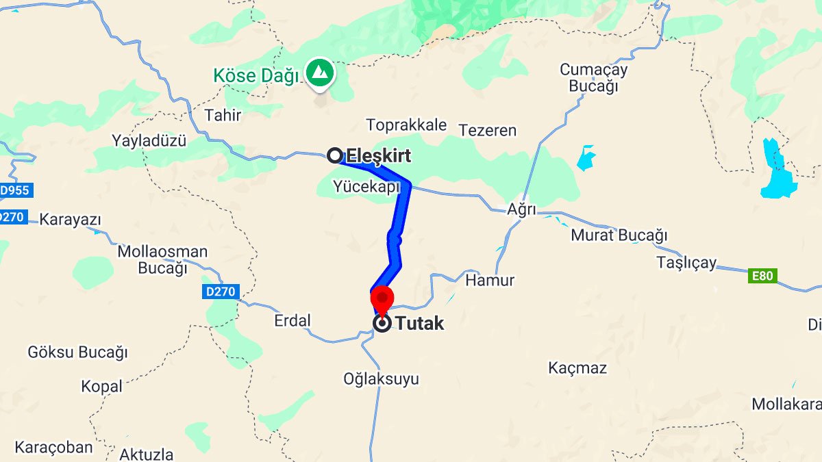 Devamında, D100/E80 güzergâhı boyunca Tutak ilçesine doğru 40,6 kilometrelik bir sürüş gerçekleştirilir. Bu bölüm, trafiğin normal seyrettiği koşullarda yaklaşık 52 dakika sürmektedir. Yol boyunca geniş ve düzgün asfalt yol yapısı sürüş konforu sağlamaktadır.