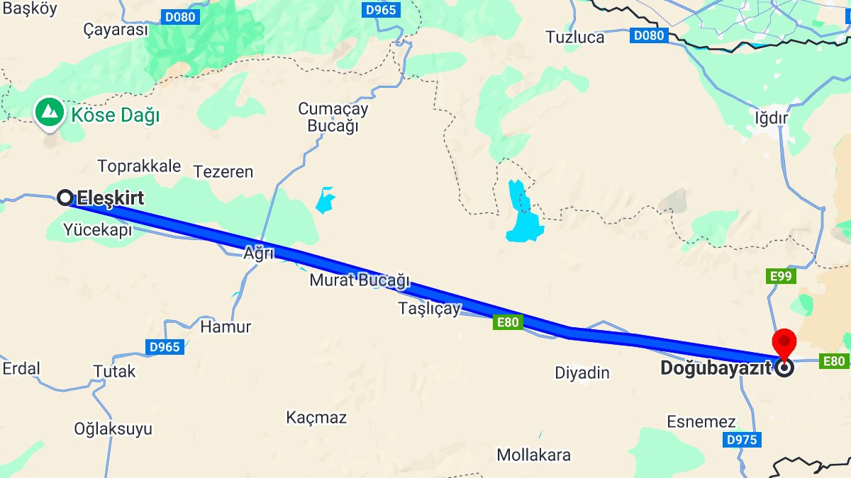 Araçla seyahat edenler için en hızlı rota, Gerede - Gürbulak Otoyolu (D100/E80) üzerinden sağlanmaktadır. Bu güzergâhta, Eleşkirt merkezinden çıkıldıktan sonra Cumhuriyet Caddesi takip edilerek Erzurum Ağrı Yolu'na bağlanılır. Yaklaşık 126 kilometrelik bu yolculuk sonrasında Iğdır Doğubeyazıt Yolu üzerinden Doğubayazıt'a ulaşılır.