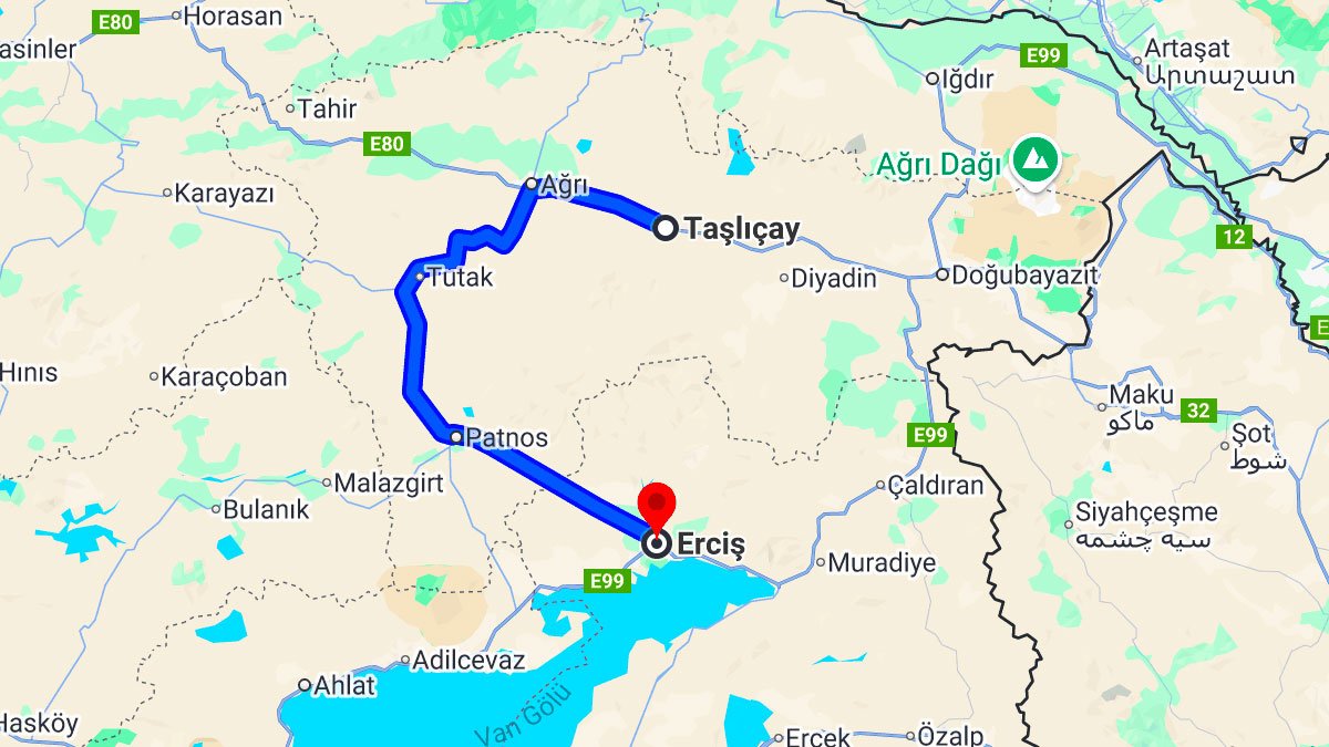 Seyahat güzergâhı, Gerede - Gürbulak Otoyolu (D100/E80), Ağrı-Hamur-Tutak-Patnos Yolu, D965 ve D280 rotaları üzerinden ilerlemektedir. Taşlıçay'dan çıkıldıktan sonra bu yollar üzerinden yaklaşık 164 kilometrelik bir rota izlenir. Son bölümde Zeylan Caddesi üzerinden Erciş ilçe merkezine ulaşılır.