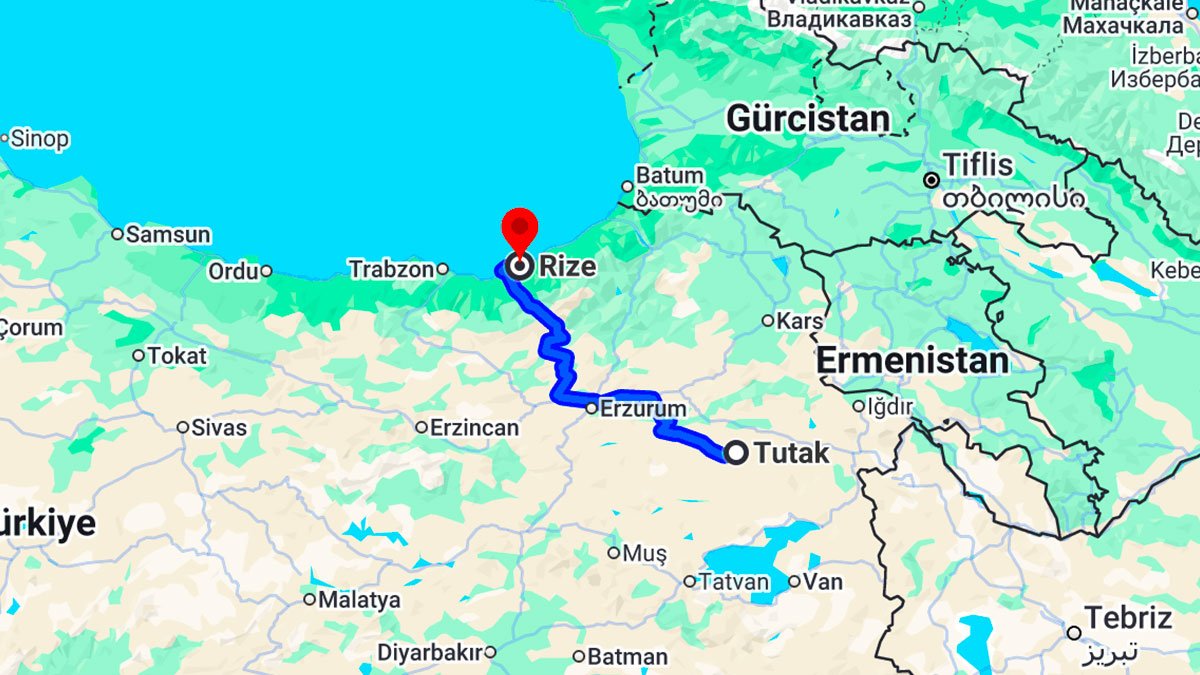 Tutak ile Rize arasındaki mesafe karayoluyla 437 kilometredir. Tutak - Rize arası araba yolculuğu ortalama 5 saat 48 dakika sürmektedir.