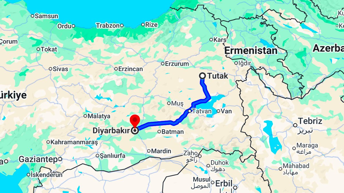 Yolculuk, D360 ve E99 kara yolları üzerinden yapılmaktadır. Tutak'tan çıkışta Kömürlü yönünde ilerlenerek yaklaşık 80 kilometrelik bir mesafe kat edilir. Sonrasında E99 karayolu boyunca devam edilip, D885 çıkışı kullanılarak Diyarbakır yönüne geçilir.