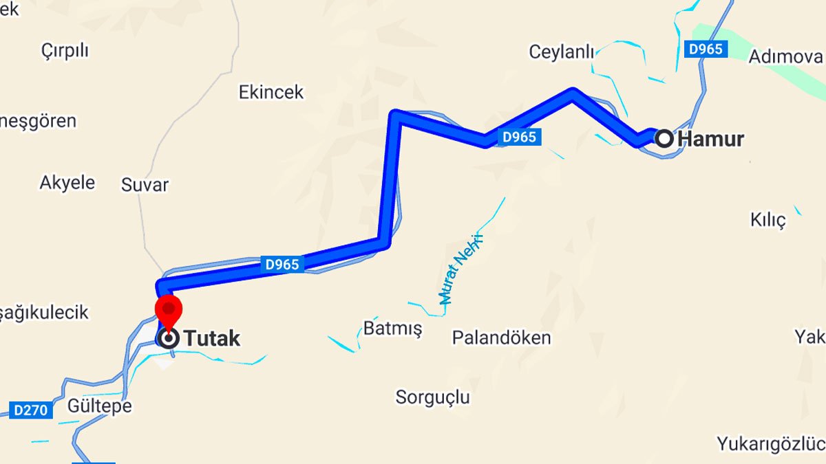 Yolculuk, Hamur ilçesinden Ağrı Bitlis Yolu (D965) yönünde başlar. Batı yönünde 1,1 km ilerledikten sonra Ağrı-Hamur-Tutak-Patnos Yolu yönüne sağa dönülür ve yaklaşık 25,1 km boyunca bu yolda devam edilir. Ardından döner kavşaktan ikinci çıkışa girilerek 850 metre gidilir. Buradan 214. Sokak yönünde 1,1 km ilerlenir. 1. Cadde'ye sola dönülür ve son olarak 115. Sokak üzerinden düz şekilde 40 metre devam edilerek Tutak ilçe merkezine ulaşılır.