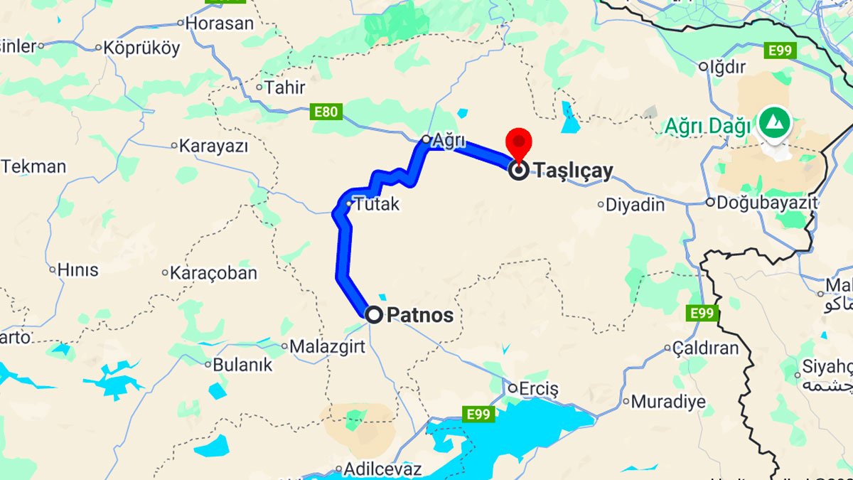 Yolculuk Patnos ilçesinden başlamakta olup, Malazgirt Caddesi üzerinden D280 yoluna girilerek Van Bulvarı yönüne ilerlenmektedir. Emniyet Caddesi ve Atatürk Bulvarı güzergâhı üzerinden Ağrı Bitlis Yolu'na (D965) çıkış yapılır. D965 karayolu boyunca devam edilerek Ağrı-Hamur-Tutak-Patnos Yolu üzerinden Taşlıçay'a ulaşım sağlanır. Yolculuğun son aşamasında D100/E80 otoyolu kullanılmaktadır. Yol genel olarak bölünmüş ve asfalt bir güzergâhtan oluşur.