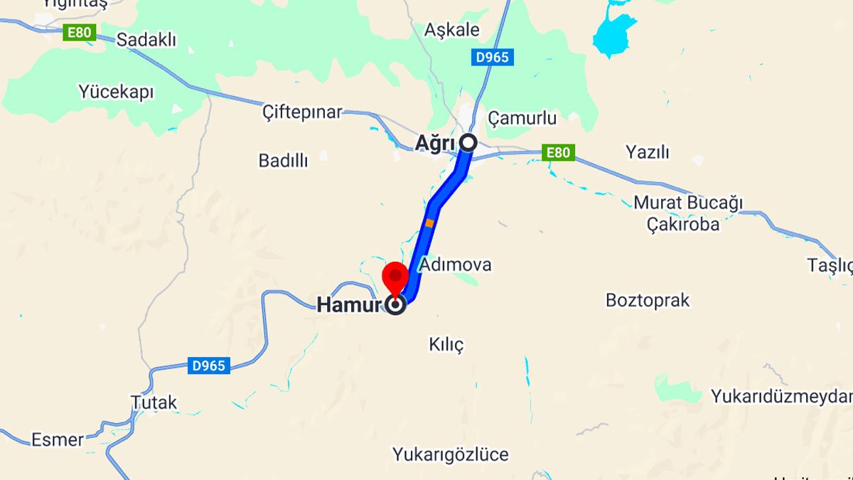 Ağrı şehir merkezinden Hamur ilçesine ulaşım için en hızlı güzergâh D965 karayolu üzerinden sağlanmaktadır. Yeni Van Caddesi (D965) yönünde güneye doğru yaklaşık 120 metre ilerlenir. Ardından aynı cadde üzerinden 12,2 kilometre boyunca devam edilir. Son olarak, Ağrı Bitlis Yolu (D965) yönünde sağa dönülerek 1,9 kilometre daha gidilir ve Hamur ilçe merkezine ulaşılır.