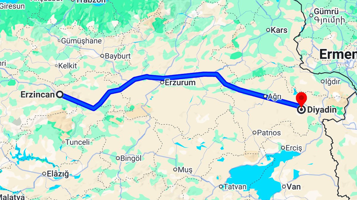 Erzincan ile Diyadin arasındaki mesafe karayoluyla 428 kilometredir. Erzincan - Diyadin arasında otomobille yolculuk ortalama 5 saat 36 dakika sürmektedir.