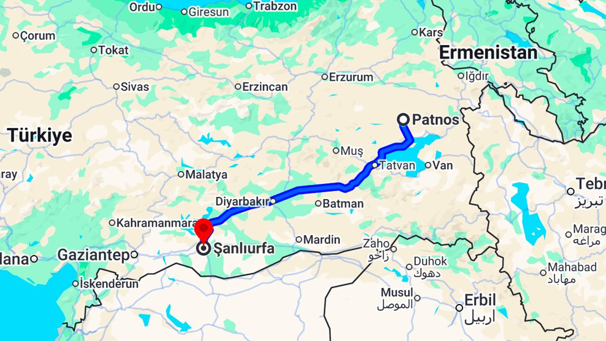 Patnos ile Şanlıurfa arasındaki mesafe karayoluyla 538 kilometredir. Patnos - Şanlıurfa arası otomobil yolculuğu ortalama olarak 7 saat 12 dakika sürmektedir.