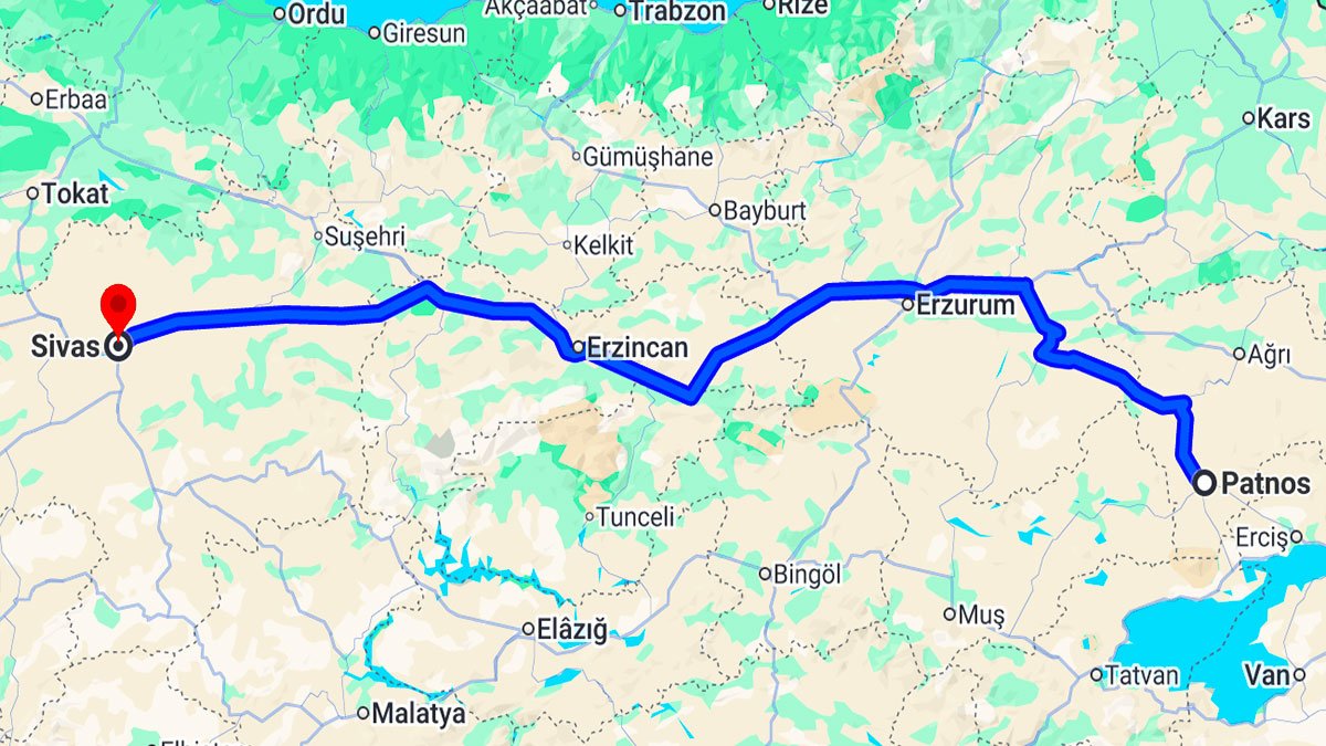 Yolculuk, Patnos'un merkezinden Malazgirt Caddesi üzerinden başlar. Van Bulvarı ve Atatürk Bulvarı takip edilerek D965 karayoluna çıkılır. Ardından Tutak, Karayazı ve Erzurum güzergâhları geçilerek D100/E80 otoyoluna bağlanılır. Yolculuk büyük oranda Gerede - Gürbulak Otoyolu (E80) üzerinden devam eder.