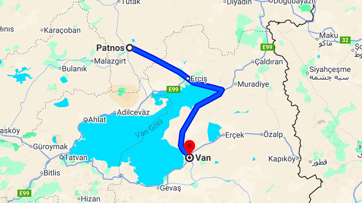 Yolculuk Patnos şehir merkezinden başlayarak Malazgirt Caddesi (D280) üzerinden kuzey istikametinde ilerlenir. Van Bulvarı'na bağlanıldıktan sonra D280 karayolu boyunca yaklaşık 53,5 kilometre yol alınır. Bu noktadan sonra Erciş Van Yolu (D280/E99) üzerinden Erciş geçilerek Van yönüne devam edilir.
