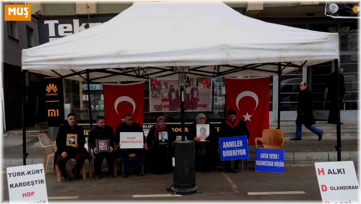 Muş - Çocuklarının terör örgütü PKK mensupları tarafından dağa kaçırıldığı iddiasıyla HDP Muş İl Başkanlığı önünde oturma eylemi başlatan aileler, kararlı bir şekilde devam ettirdikleri evlat nöbetine bu hafta da devam etti. HDP İl Başkanlığı önünde toplanan aileler, "Halk düşmanı parti", "Evlatlarımızı vereceksiniz", "Ha HDP ha PKK", "Türk-Kürt kardeştir, HDP kalleştir", "Halkı dolandıran parti", "Anneler direniyor", "Artık yeter yakamızdan düşün" ve "Yeter artık evlatlarımızı bırakın" yazılı pankartlar açtı. Her çarşamba parti önünde bir araya gelen anne ve babalar, fotoğraflarını taşıdıkları çocuklarına teslim olmaları için çağrıda bulundu.