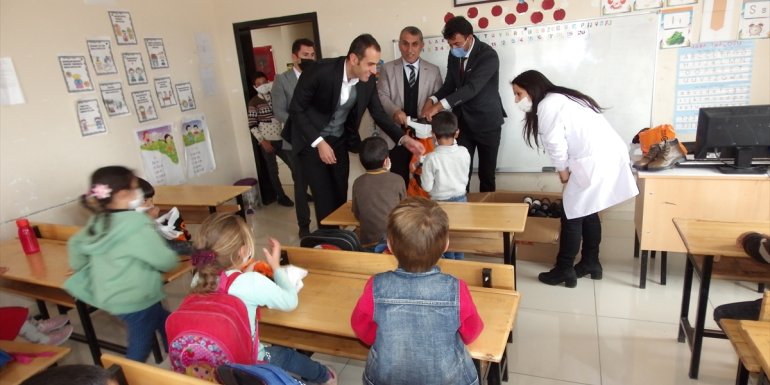 Adilcevaz Kaymakamı İsmail Demir ve İlçe Milli Eğitim Müdürü Yavuz Beşkardeş, gönderilen kışlık ayakkabıları öğrencilere hediye etti.