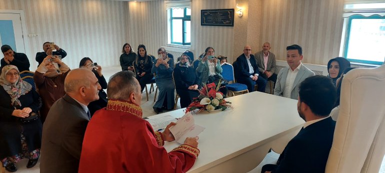 Nikah töreni, Ağrı Belediyesi nikah salonunda gerçekleşti. Karadoğan, nikah cübbesi giyerek Gezer ve Yılmaz çiftinin nikahını resmi olarak kıydı. Bircan Balcı ve Halime Öz, törende nikah şahidi olarak yer aldı. Çiftin nikahının kıyılmasının ardından Başkan Karadoğan, şahitlerin imzası sonrasında genç çiftlere bir ömür boyu mutluluklar diledi ve evlilik cüzdanını Şadiye Gezer'e takdim etti.
