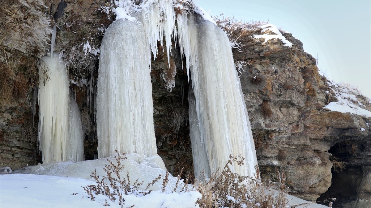 Dondurucu soğukların etkisi altındaki Ağrı'da da Yolyazı köyü mevkisindeki kayalıklarda 5 metreyi bulan buz sarkıtları oluştu.