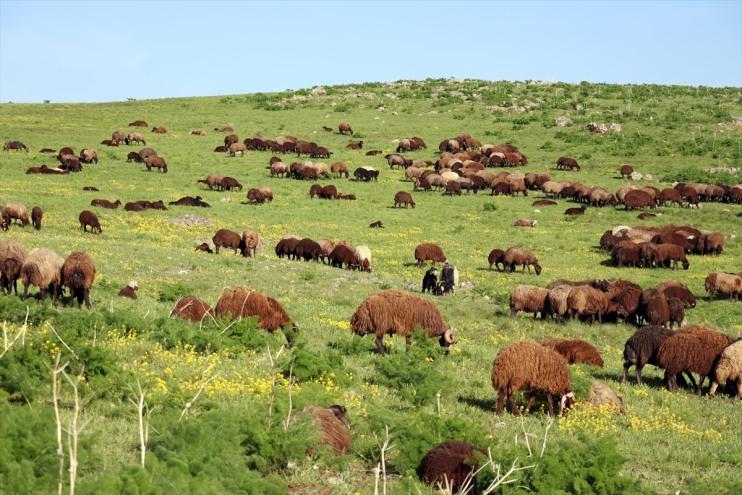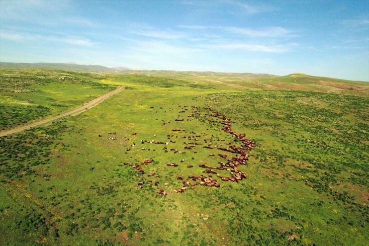 Eşsiz manzaranın ortaya çıktığı dağlar ve bölgede otlayan küçükbaş hayvanlar, dronla görüntülendi.