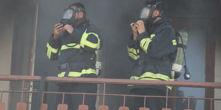 Merdivenleri yıkılan bir binanın 3. katında yaralanarak mahsur kalan bir kişinin temsil edildiği maket de ekiplerce halat yardımıyla aşağı indirilip ambulansa alındı.