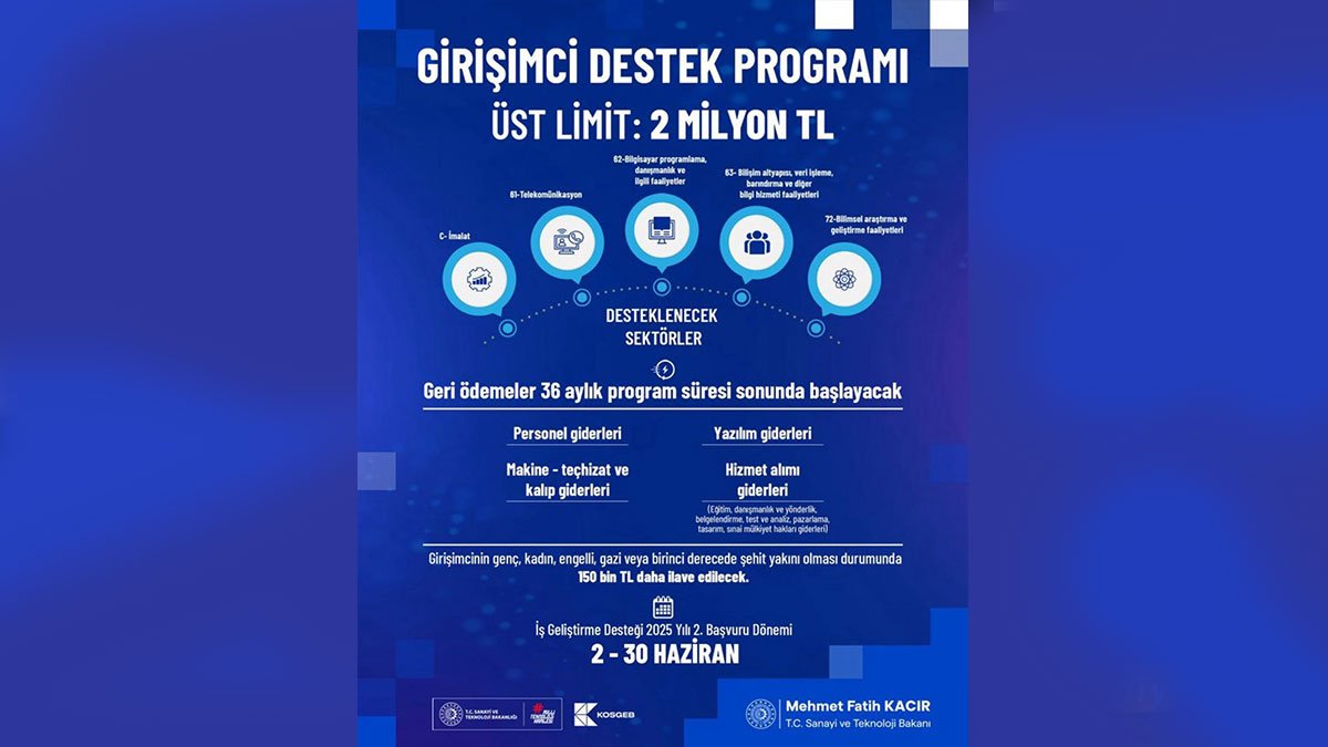 Destek programı; bilişim, imalat ve Ar-Ge alanlarında faaliyet gösteren girişimcileri kapsıyor. Başvurular, 2 Haziran - 30 Haziran 2025 tarihleri arasında alınacak.