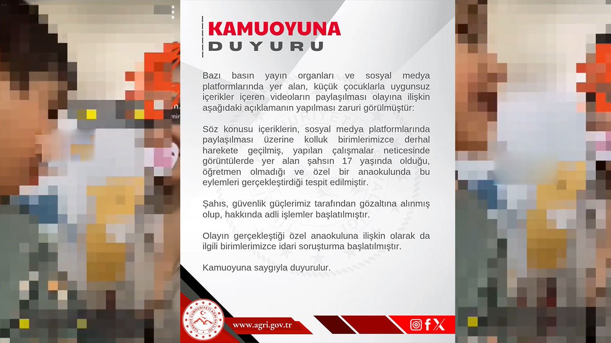 Ağrı Valiliği, bazı sosyal medya platformlarında küçük çocuklarla uygunsuz içerikler içeren videoların paylaşılmasına ilişkin yazılı açıklama yayımladı.